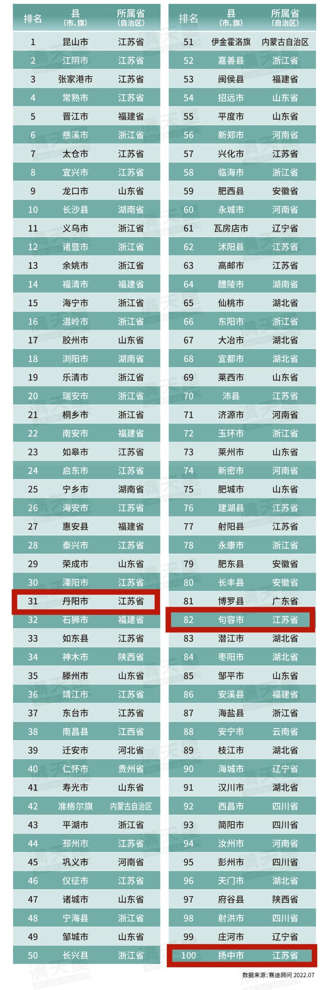 7月20日,工信部下属研究机构赛迪顾问发布“2022赛迪百强县榜单”,镇江丹阳市、句容市和扬中市全部上榜。其中,丹阳市位列第31位;句容市位列第82位;扬中市位列第100位。