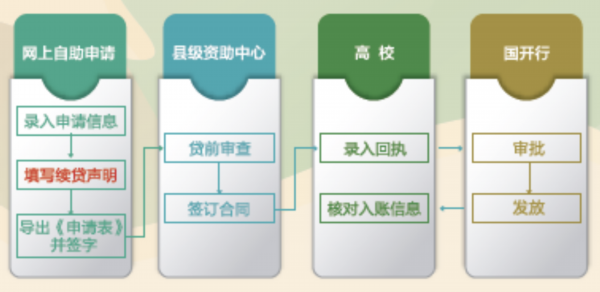 学生登录“学生在线系统”提交续贷申请,如果县中心开通远程受理权限,则学生可以选择“网上签订合同”,网签合同待县中心远程审查后,学生登陆“学生在线系统”下载或打印受理证明,交高校录入回执,完成续贷流程。