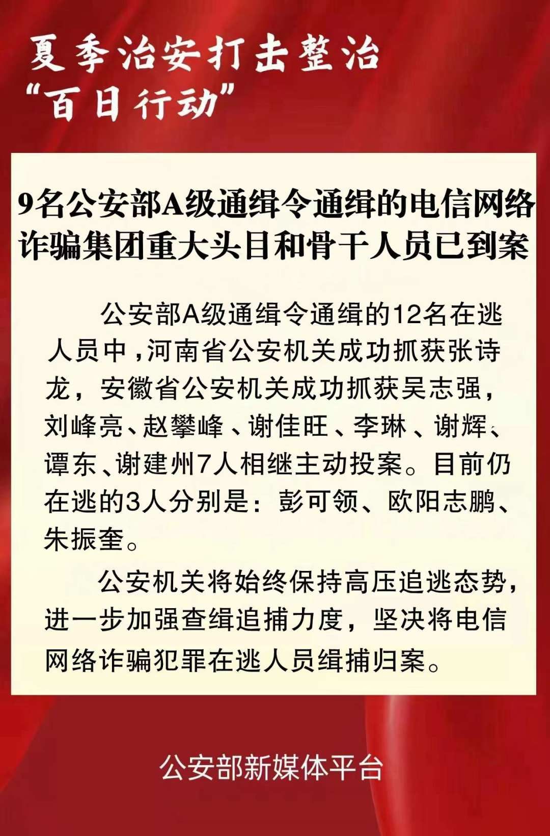 据了解,为依法严厉打击电信网络诈骗犯罪,切实维护人民群众财产安全和合法权益,公安部会同最高人民法院、最高人民检察院等部门部署在全国开展为期一年的“拔钉”行动,并发布A级通缉令公开通缉电信网络诈骗犯罪集团重大头目和骨干人员。各地公安机关闻令而动、迅速出击,全力开展缉捕追逃,向电信网络诈骗犯罪在逃人员发起凌厉攻势。经过大量缜密细致的侦查工作,6月11日,河南省公安机关成功抓获张诗龙(男,福建省德化县人);6月12日,安徽省公安机关成功抓获吴志强(男,福建省晋江市人)。同时,在公安机关强大缉捕压力和政策感召下,刘峰亮(男,河南省汝州市人)、赵攀峰(男,湖南省双峰县人)、谢佳旺(男,福建省安溪县人)、李琳(男,江苏省新沂市人)、谢辉(男,福建省宁化县人)、谭东(男,福建省建瓯市人)、谢建州(男,福建省建瓯市人)7人相继主动投案。目前仍在逃的3人分别是:彭可领、欧阳志鹏、朱振奎。