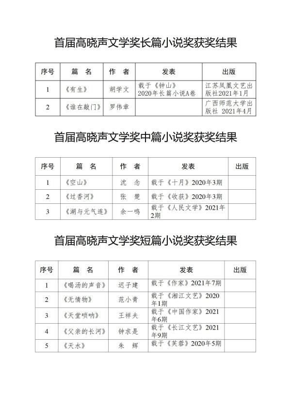 2022年7月22日,首届高晓声文学奖在江苏常州揭晓,《有生》《空山》《喝汤的声音》等10部(篇)作品分获长篇小说奖、中篇小说奖、获短篇小说奖。高晓声文学奖作为江苏文学奖项的新一员,正式起航。