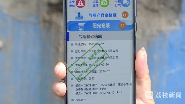 南京百江液化气有限公司安检人员杨伟伟一边演示扫码一边介绍说:“扫码后用户可以查看钢瓶充装有没有异常,我使用的气是不是有正规的气源;是谁配送的,什么时间配送的。这个就是确保钢瓶整个留存周转在监管范围内。然后还有钢瓶信息,就是钢瓶有没有在正常的核检期内、有效期内。”