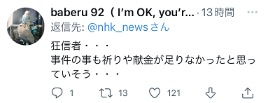 山上母亲的这番言论在日本网络上受到多名网友的批评,有人评论称:“狂信徒。估计她觉得事件的发生是因为捐钱和祈祷还不够。”↓