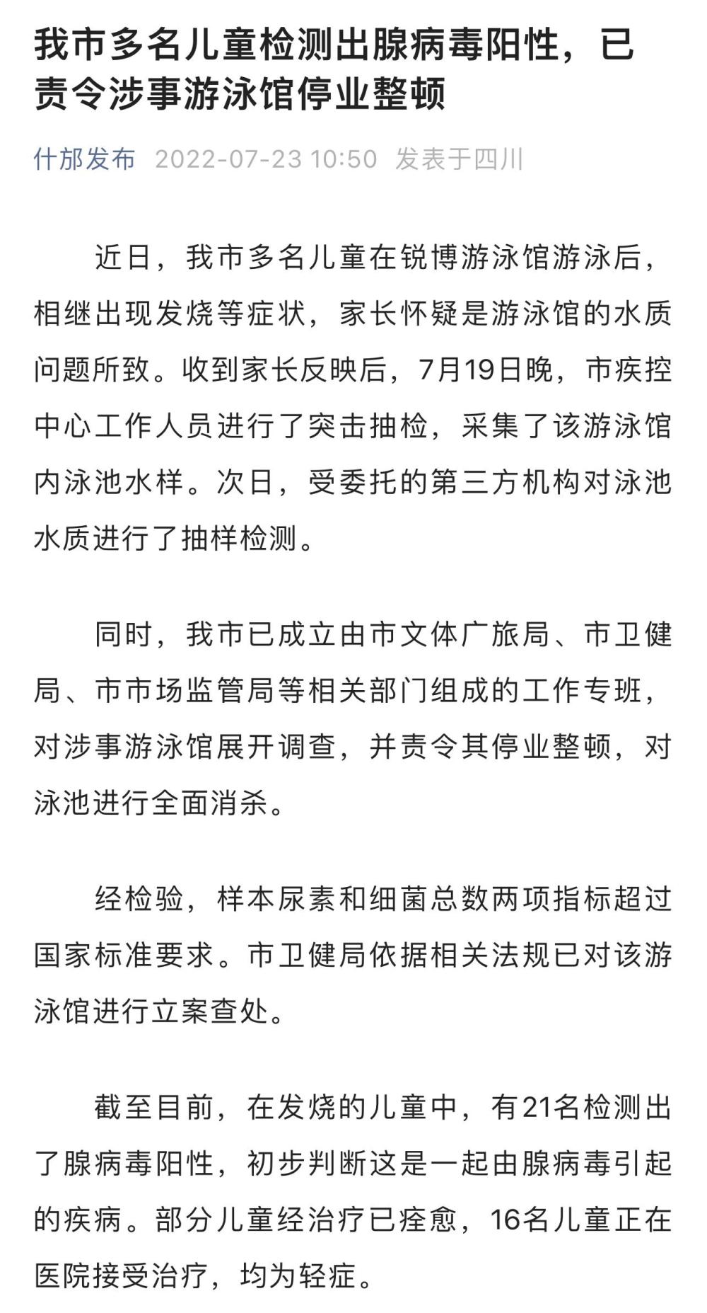 荔枝新闻讯 据“什邡发布”微信公号消息,近日,在四川什邡市有家长反映数名儿童在当地一游泳馆游泳后,相继出现发烧等症状。7月22日,四川省什邡市联合调查处置工作组发布通告称,儿童患病是由腺病毒引起的,已责令涉事游泳馆停业整顿,并依据相关法规对该游泳馆进行立案查处。