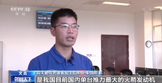 问天舱任务液氧加注指挥员 朱凯祥:作为一级半构型的火箭,它的芯一级采用的是液氢液氧的发动机,然后助推的液氧煤油发动机是我国目前国内单台推力最大的火箭发动机。我们系统的任务就是在加注发射程序中,按时精准完成液氢液氧煤油的加速发射工作,为火箭的飞行提供源源不断的动力。