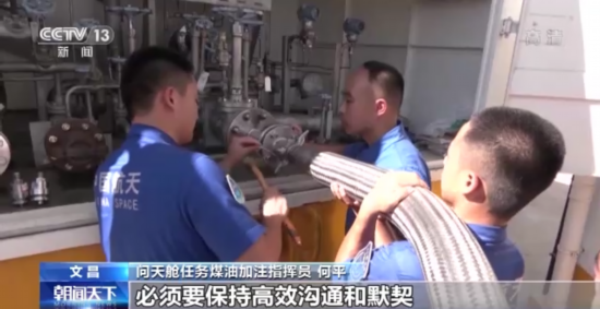 问天舱任务煤油加注指挥员 何平:仅一个加注库区就有上百台阀门,加注流程都是环环相扣的,每一个加注动作都必须按照指定时间规范准确完成,因此指挥员和现场操作手之间必须要保持高效沟通和默契。指令从后端发出后,前端必须在第一时间迅速正确完成。