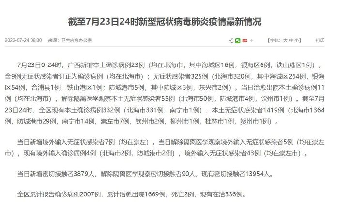 广西累计报告确诊病例2007例,累计治愈出院1669例,死亡2例,现有在治336例。