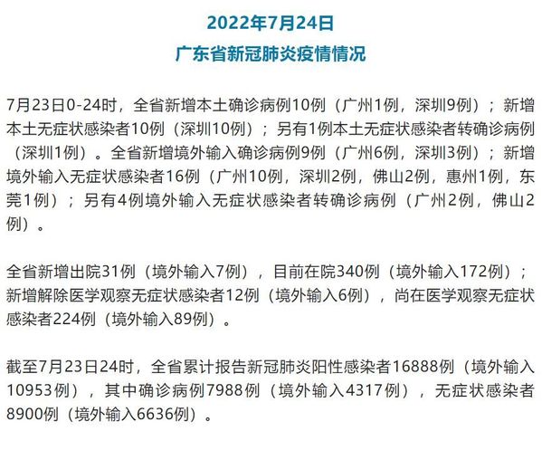 荔枝新闻讯 7月23日0-24时,全省新增本土确诊病例10例(广州1例,深圳9例);新增本土无症状感染者10例(深圳10例);另有1例本土无症状感染者转确诊病例(深圳1例)。全省新增境外输入确诊病例9例(广州6例,深圳3例);新增境外输入无症状感染者16例(广州10例,深圳2例,佛山2例,惠州1例,东莞1例);另有4例境外输入无症状感染者转确诊病例(广州2例,佛山2例)。