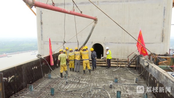 今天上午,记者在距离地面236米的、南京仙新路过江通道跨江大桥南塔上横梁施工现场看到,施工人员正在加紧进行混凝土的浇筑,到中午11点,浇筑顺利完成,这也标志着跨江大桥南塔主体结构施工圆满完成。