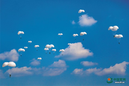 清晨,某军用机场,数百名跳伞员借助微弱晨光,快速完成伞具整理、武器披挂、装备检查等准备工作,随后通过多道检查线,按照战斗编组有序登机。伴着巨大的轰鸣声,数架战机依次升空,向预定空域快速突进。