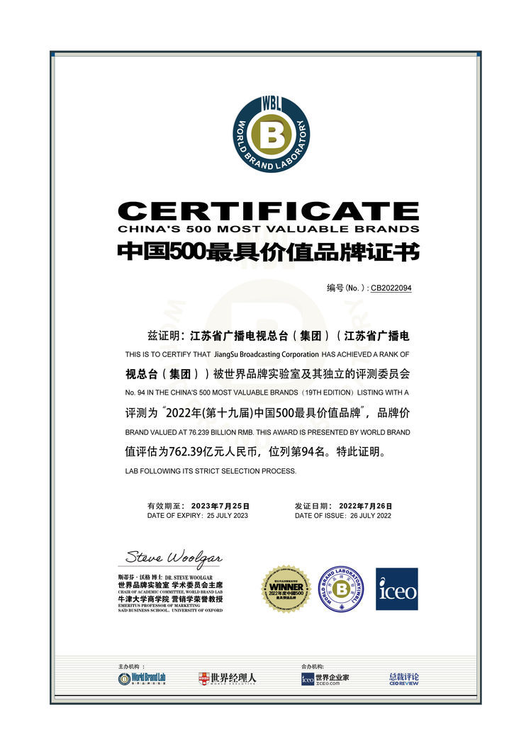 本次中国500最具价值品牌是江苏省广播电视总台(集团)连续第19年入选,并且连续第7年排行前100位。