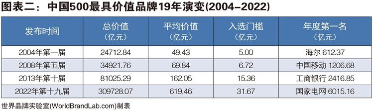 世界品牌实验室编制中国品牌报告已是第19个年头,2004年入选门槛仅为5亿元,前500名品牌的平均价值为49.43亿元。19年以后的2022年,入选门槛已经提高到31.67亿元,而前500名品牌的平均价值高达619.46亿元,增加幅度为1153.21%。