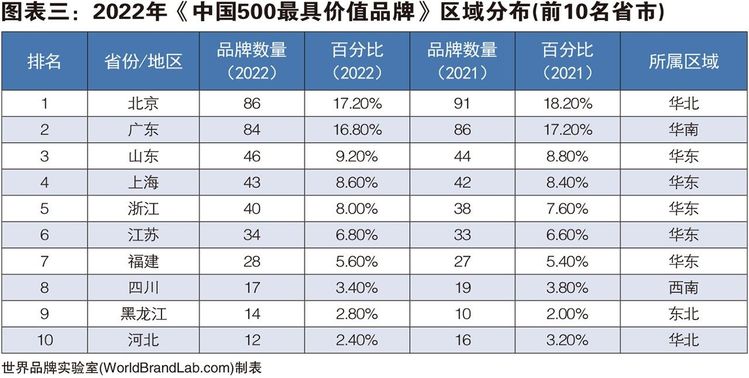 据世界品牌实验室分析,一个区域的竞争实力,主要取决于其比较优势,而品牌效益直接影响着地区比较优势的形成和发展。品牌是一个地区发展的重要标志,品牌带动区域经济的增长,区域经济的发展又促进当地品牌的成长。从本届《中国500最具价值品牌》区域分布来看,北京有86个品牌入选,名列第一,主要原因是赢利能力强的央企总部集中在北京。榜单中具有全国范围影响力的品牌有438个,占87.60%;具有世界性影响力的品牌数为62个,占12.40%,比去年略有增加。
