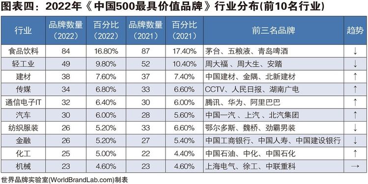尽管新冠疫情没有阻挡中国品牌价值整体上升的趋势,但是与去年相比,航空、旅游服务、纺织服装、地产、零售等受疫情影响大的行业入榜品牌数量均出现下降,而汽车、通信电子IT、农业等行业入榜品牌均有不同程度增加。本年度《中国500最具价值品牌》排行榜中,共有来自食品饮料、轻工业、建材、传媒、纺织服装、医药、机械等在内的25个相关行业的品牌入选。其中食品饮料业依然是入选品牌最多的行业,共有84个品牌入选,占总入选品牌数的16.80%;入选数量位居第二到第五的行业分别是轻工(49个)、建材(38个)、传媒(34个)、通信电子IT(32个)。本年度共有69个中国品牌的价值超过1000亿,比去年增加了12个。