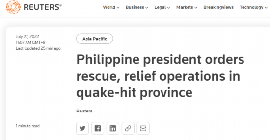 当地时间27日上午,菲律宾发生7.0级地震。据路透社27日最新消息,菲律宾总统马科斯的新闻秘书当天称,马科斯已下令向震区立即派遣救援队,他本人也将飞往地震震中阿布拉省。