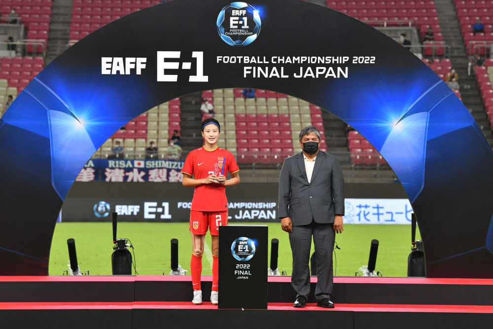 7月26日,中国队球员汪琳琳(左)获颁最佳后卫奖。新华社发(日本足球协会供图)