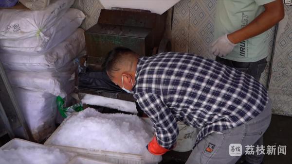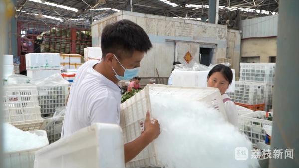 在华东农业大市场,记者见到运冰人们正忙得热火朝天,他们从冰库里抱出一大块冰,通过窗口直接投入到粉碎机内,打成碎冰后,再装入塑料筐中。工人们熟练地将箩筐摆好放在电动三轮车上准备配送。