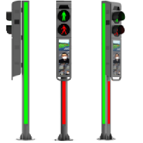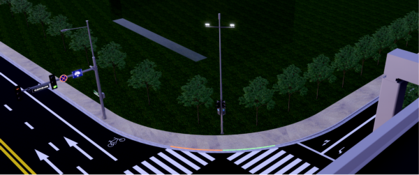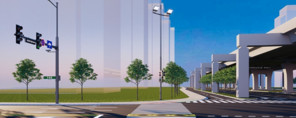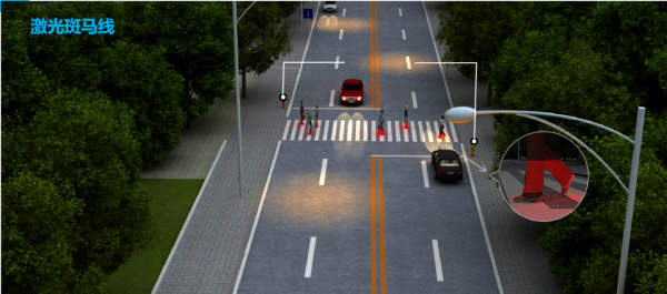 从效果图上看到,高浪路地面道路斑马线两头设置了激光脉冲灯,根据对环境的感应,投射红色激光在行人小腿处,向远处司机发出红色警示。
