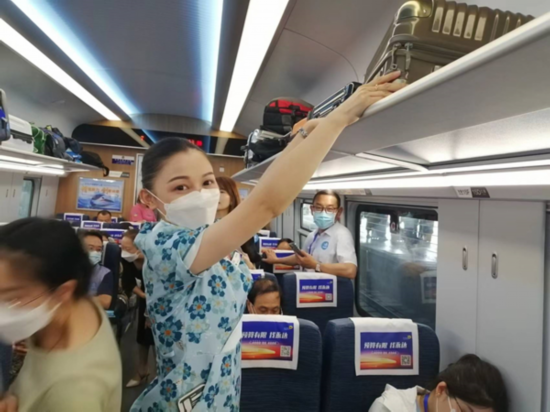 7月27日,列车长赵莹静在整理旅客的行李。新华网记者 侯强 摄