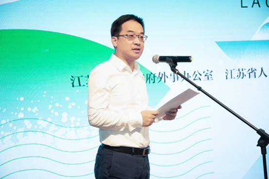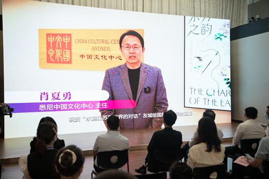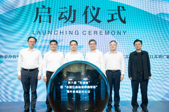 7月28日上午,第六届“友城绘”暨“水韵江苏与世界的对话”海外巡展启动仪式在江苏省现代美术馆成功举办。江苏省人民政府外事办公室副主任刘建东,江苏省人民政府新闻办公室副主任胡竹,江苏省文化和旅游厅二级巡视员徐循华,江苏省教育厅副厅长杨树兵,江苏省广播电视总台党委委员崔峰,江苏省文学艺术界联合会副主席、书记处书记刘旭东出席仪式。江苏省的国际友城日本丰桥市市长浅井由崇,日本鹿儿岛县南萨摩市市长本坊辉雄,和阿根廷萨尔塔市文化局副局长罗利·阿里阿斯分别为活动视频致辞,回顾了江苏与国际友城之间因“友城绘”而缔结的深厚友谊,同时对未来的交流充满期待。澳大利亚悉尼、日本东京、马来西亚吉隆坡、荷兰海牙、韩国首尔的中国文化中心主任们也为活动发来了远程的问候,预祝海外巡展顺利举办。