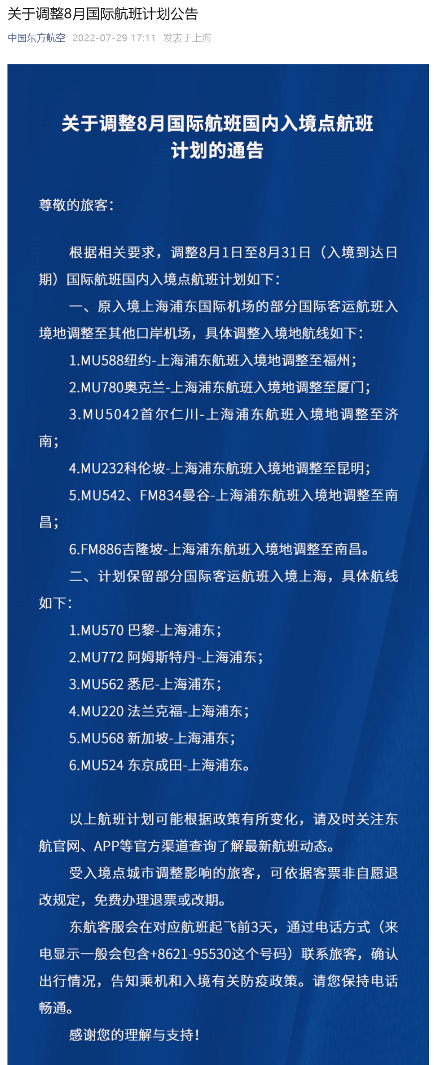 以上航班计划可能根据政策有所变化,请及时关注东航官网、APP等官方渠道查询了解最新航班动态。
