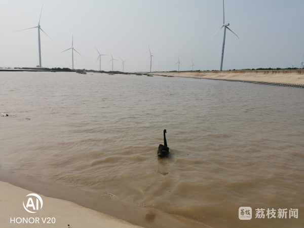 第二天一早,潘振海就将发现黑天鹅的情况告诉了淮海农场四分场的干事,请他上报农场相关部门。分场干事接到信息后,立即与淮海农场社区综合管理科负责林业和畜禽养殖的王增平联系。上午9点左右,王增平他们一行来到潘振海的家中,看到一只通体黑色的“大鹅”正在院子里悠闲地踱步,目测“大鹅”体长约1米,体重约5公斤,健康状况较好,形态十分漂亮。经对黑天鹅全身抚摸检查,没有发现明显的外伤,而且状态良好,吃喝也正常。经与射阳县自然资源和规划管理局负责林业管理的人员联系后,驱车来到人少的大海边放生。