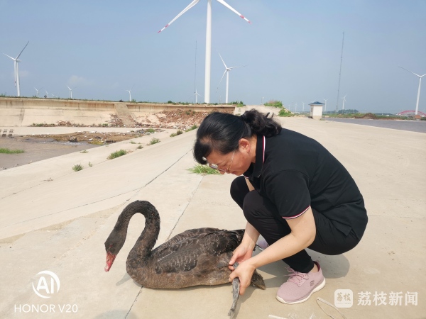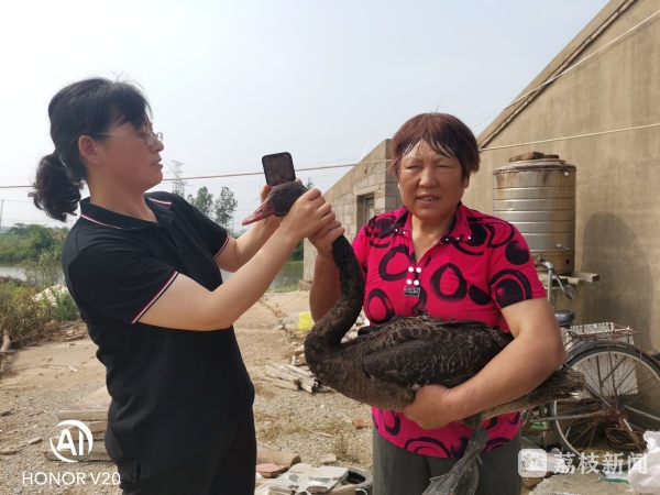 7月27日傍晚,家住射阳县淮海农场四分场社区27大队电灌站职工潘振海在去水稻田里排水时,发现一只黑色的大鹅在水稻田里戏水,大鹅的“S”形脖颈修长,红嘴,通体黑褐色,姿态十分优美。他意识到这只“大鹅”并非寻常之物,而且不怕人,赶也赶不走。为防不测,于是他将这只“大鹅”抱回了家。
