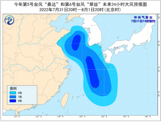 大风预报:7月31日20时至8月1日20时,山东南部沿海、江苏沿海、黄海大部、东海中东部将有6-7级风,“桑达”和“翠丝”中心经过的附近海面风力有8级,阵风9-10级。