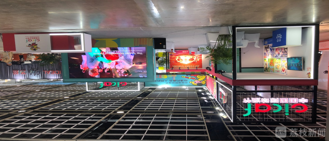 致力于为动漫创意对接国内国际播出平台和投资市场,展位创造现代简约设计风格空间概念,把空间感,立体感,时尚感,节奏感的设计风格结合动漫切入主题定位。100多平米的展厅分为观影区、展示区、洽谈区、接待区、四个区域。三年以来大会累计入围了上百部优质动漫作品,并评选出18个获扶持动漫项目,这些作品将在观影区进行播放、展演。其中空间设计方面,海报展与大屏构成上半部分空间,下半部分空间设置阶梯式座椅长廊作为休息区,从而包裹整个空间。五彩斑斓的动漫海报点缀现代简约空间,在色彩冲突中营造轻松、明快的氛围。在历届大会红色动漫专场、国际交流交易环节中,动漫作品丰富多彩,每年获得大会扶持的动漫作品也在创投融方面赢得了一定的市场。展位将这些优质动漫成果、衍生品周边引进到展示区进行集中展示。并与大会会址——南京园博园文创相结合,设置灯箱、3D互动体验等物料,配合直板、立板及设计,营造高低错落,虚实变化,打造一场小型的动漫文旅盛宴。