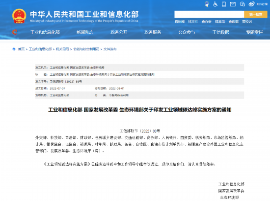 中国网财经8月1日讯 工业和信息化部、国家发展改革委、生态环境部近日印发工业领域碳达峰实施方案。其中提到,“十四五”期间,产业结构与用能结构优化取得积极进展,能源资源利用效率大幅提升,建成一批绿色工厂和绿色工业园区,研发、示范、推广一批减排效果显著的低碳零碳负碳技术工艺装备产品,筑牢工业领域碳达峰基础。到2025年,规模以上工业单位增加值能耗较2020年下降13.5%,单位工业增加值二氧化碳排放下降幅度大于全社会下降幅度,重点行业二氧化碳排放强度明显下降。