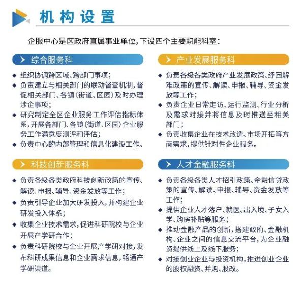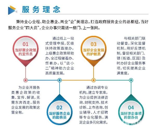 该中心通过整合全区各部门涉企服务事项,最大限度减环节、优流程、强服务,建设一站式线下服务大厅和线上综合服务平台,为企业提供广覆盖、全过程、信息化、精准化、便利化的服务,实现服务一站供给、业务一网受理、诉求一帮到底。