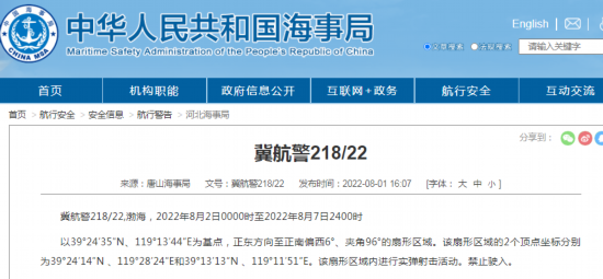 冀航警218/22,渤海,2022年8月2日0000时至2022年8月7日2400时