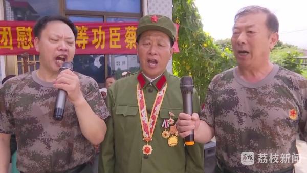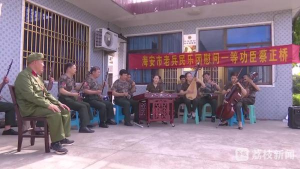 今天(8月1日)上午,南通海安市的一个由退伍军人组成的民乐团自发到李堡镇杨庄村蔡正桥家中,一起慰问这位曾经参加过对越自卫反击战的“孤胆英雄”,共同庆祝“八一建军节”。
