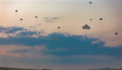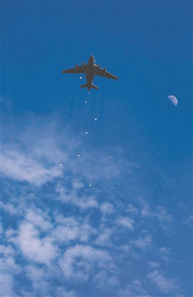伴着嘹亮的口号声,特战队员有序穿戴伞具、披挂武器装备,随后按照作战编组快速登机。不多时,数架运输机呼啸升空,直插云霄。抵达预定空域后,舱门缓缓打开,特战队员手握拉绳、含胸、屈膝,做好伞降准备。“跳!”投放员下达命令,特战队员快速跃出机舱。转瞬之间,数千米高空绽放出朵朵伞花。