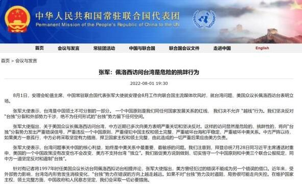 8月1日,安理会轮值主席、中国常驻联合国代表张军大使就安理会8月工作向联合国主流媒体吹风时,就台湾问题、美国众议长佩洛西访台表明立场。