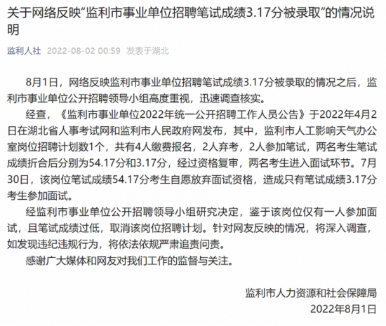 经查,《监利市事业单位2022年统一公开招聘工作人员公告》于2022年4月2日在湖北省人事考试网和监利市人民政府网发布,其中,监利市人工影响天气办公室岗位招聘计划数1个,共有4人缴费报名,2人弃考,2人参加笔试,两名考生笔试成绩折合后分别为54.17分和3.17分,经过资格复审,两名考生进入面试环节。7月30日,该岗位笔试成绩54.17分考生自愿放弃面试资格,造成只有笔试成绩3.17分考生参加面试。
