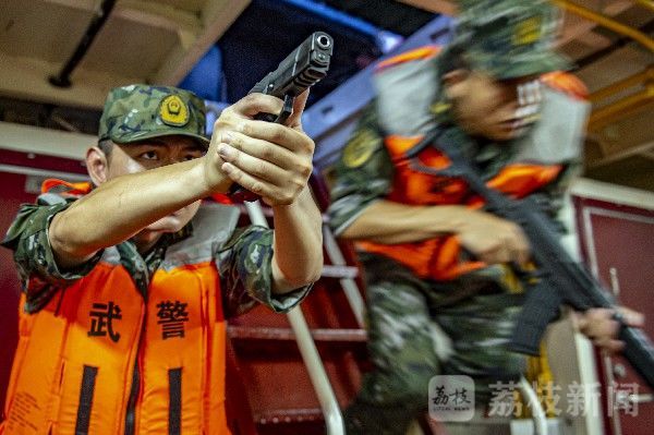 演练现场,封控组驾驶6艘冲锋舟对目标船只进行外围封控;狙击组乘巡逻艇利用艇上有利位置伺机实施精准狙击;突击组乘冲锋舟分别从目标船只两侧接近,伺机跳帮实施突击。
