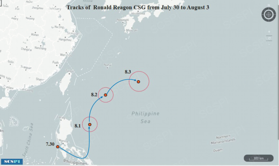 据南海战略态势感知平台推特账号的消息,8月3日,根据“灰狗”航母舰载运输机的活动轨迹判断,美国“里根”号航母打击群继续向东移动。此前,“里根”号航母被发现在巴士海峡以东海域活动。