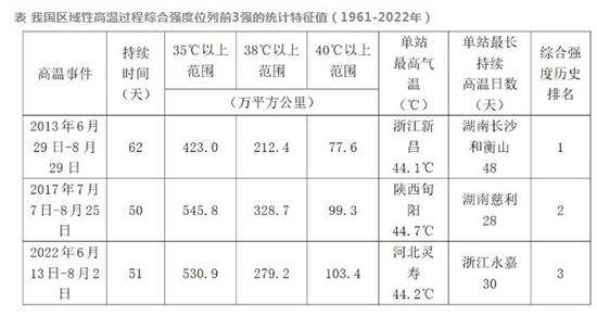 综合考虑高温事件的影响范围、平均强度和持续时间,此次事件综合强度为1961年以来第3强,仅次于2013年和2017年。总体看来(见下表),今年的区域性高温过程开始时间早于2013年和2017年,持续时间仅次于2013年,影响范围和单站最高气温虽不及2017年,但已超过了2013年。