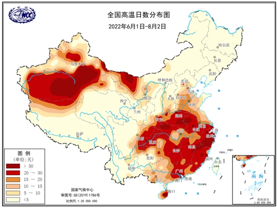 2022年6月1日-8月2日全国高温日数(单位:天)