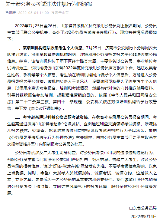 荔枝新闻讯 2022年7月25日至26日,山东省各级机关补充录用公务员网上报名期间,公务员主管部门联合公安机关,查处了2起公务员考试违法违规行为。8月4日,山东省公务员局将有关情况通报如下: