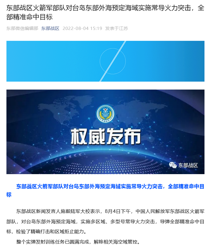 东部战区新闻发言人施毅陆军大校表示,8月4日下午,中国人民解放军东部战区火箭军部队,对台岛东部外海预定海域,实施多区域、多型号常导火力突击,导弹全部精准命中目标,检验了精确打击和区域拒止能力。整个实弹发射训练任务已圆满完成,解除相关海空域管控。