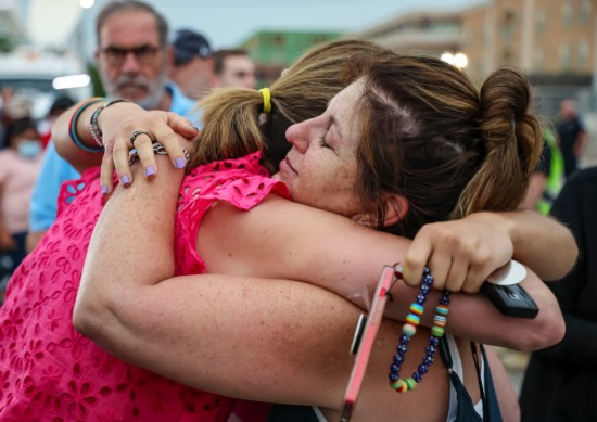 7月5日,在美国伊利诺伊州海兰帕克市,人们悼念“独立日”枪击案遇难者时相互拥抱。新华社发(乔尔·莱纳摄)