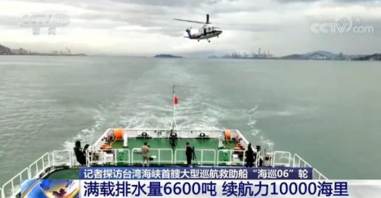 总台央视记者 郑连凯:我现在所在的位置是厦门国际邮轮中心码头,我身边停靠的就是台湾海峡首艘大型巡航救助船“海巡06”轮,这艘船,长128.6米,宽16米,体型大、能力强。它的满载排水量6600吨,最高航速23节,相当于每小时43公里左右,续航力10000海里。它能够到达全球除南北极以外的所有海域,是台湾海峡目前体型最大、能力最强的公务执法船。在船尾的甲板上,可以看到一个直升机平台,它纵向长约22.7米,横向宽约16米,差不多有一个篮球场那么大,而它的旁边就是直升机库。