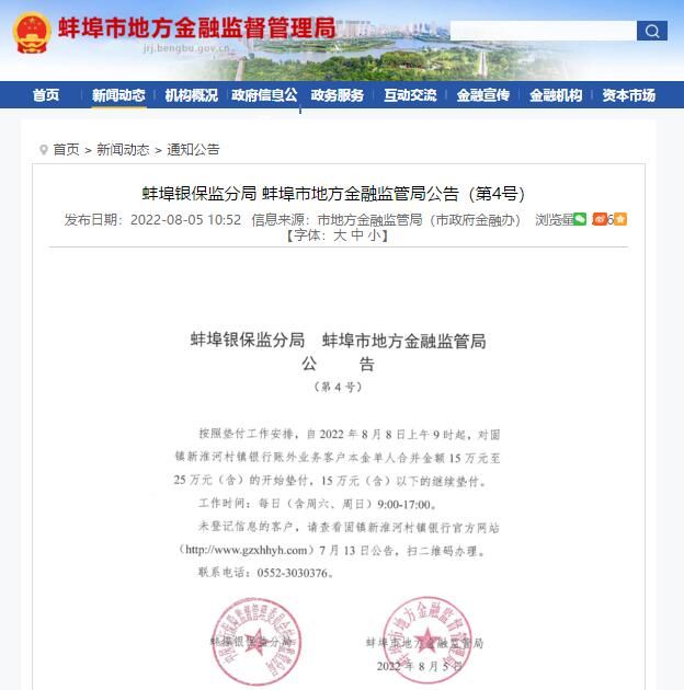 荔枝新闻讯 据安徽省蚌埠市地方金融监管局官网消息,8月5日,蚌埠银保监分局、蚌埠市地方金融监管局发布公告(第4号)称,按照垫付工作安排,自2022年8月8日上午9时起,对固镇新淮河村镇银行账外业务客户本金单人合并金额15万元至25万元(含)的开始垫付,15万元(含)以下的继续垫付。
