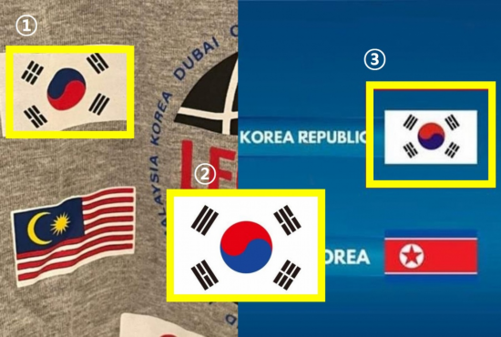 图中①为美国乐高乐园的纪念品T恤上错画的韩国国旗图案;②为正确的韩国国旗图案;③为亚足联(AFC)在举办2022年卡塔尔世界杯亚洲地区预选赛时,在对阵表中错画的韩国国旗图案。图自韩媒
