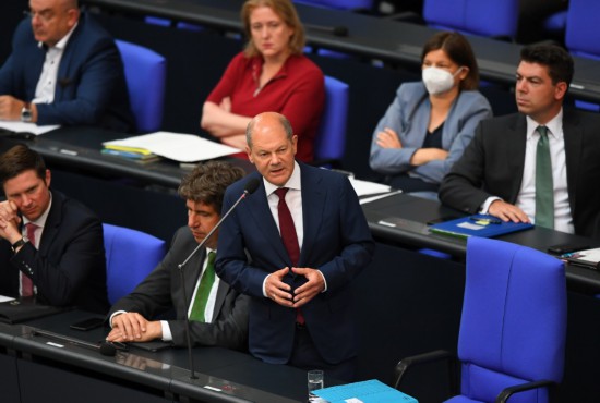 7月6日,德国总理朔尔茨(前右)在位于柏林的德国联邦议会接受例行问询。新华社记者任鹏飞摄