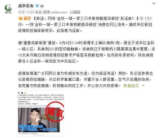 荔枝新闻讯 中共成都市成华区委宣传部官微今天发布一则“辟谣”:今(5)日,一则“金科一城一家三口未做核酸感染新冠”消息在网上流传。据成华区新冠疫情防控指挥部核实,此信息为谣言。