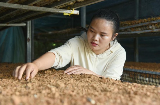 王静在蘑菇棚里查看蘑菇生长状况。新华社记者 罗羽 摄
