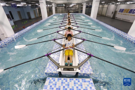 8月4日,在辽宁省沈阳市浑南区第九小学,参加暑期托管班的学生在赛艇池练习。新华社记者 王乙杰 摄