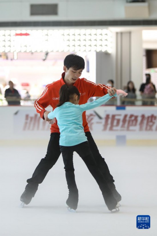 8月4日,在辽宁省沈阳市冰纷万象冰场,一名小朋友在教练的指导下学习花样滑冰。新华社记者 王乙杰 摄